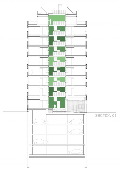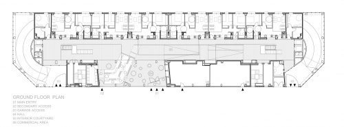 A l’intérieur, une grande cour flanquée de galeries d’accès offre des appartements avec de la lumière et de la ventilation, transformant ainsi les stagiaires maisons. Les plafonds translucides en polycarbonate sont placés comme les feuilles de tissu que la lumière frappe le sol. Également dissimulé le câblage électrique et fournissent une lumière diffuse agréable. Afin d’assurer une plus grande propreté et l’ouverture visuelle, les escaliers sont résolus saut de projection complètement en porte à faux dans l’air reliant chaque étage. Pour capter la lumière autant que possible, toute la cour est peinte en blanc avec des touches de couleur dans différentes fenêtres et façades ascenseur. Les planchers en acier galvanisé sont adaptés pour une utilisation intensive et de fournir extérieure et un patio réfléchir la lumière. Nous avons envisagé une solution mixte structurelle.