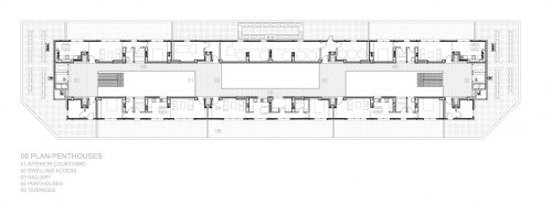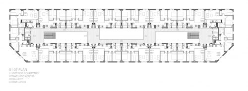 A l’intérieur, une cour flanquée de galeries d’accès fournit lumière et la ventilation des logements, qui sont stagiaires. Les galeries en métal léger vent à travers le vide intérieur et d’optimiser le nombre de cœurs, donner un nouvel qualités esthétiques, d’hygiène et d’assainissement par rapport à l’espace.
