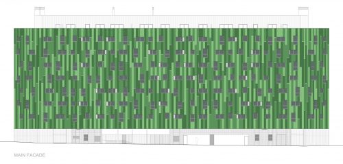 Le projet brouille son ampleur, la façade se décompose en petites unités qui véhiculent dynamisme. La peau extérieure est la peau des feuilles machihembradas polycarbonate cellulaire, durable et recyclable. Diplômé de sa teinte et la luminosité, la façade vibre.