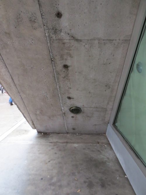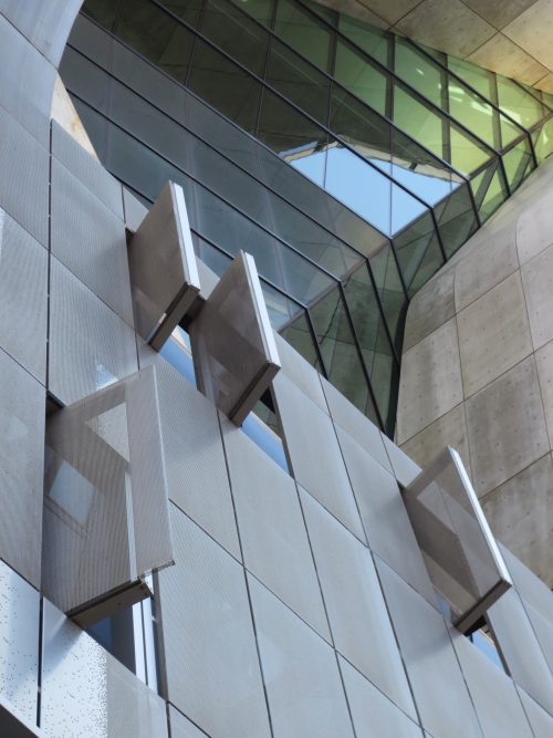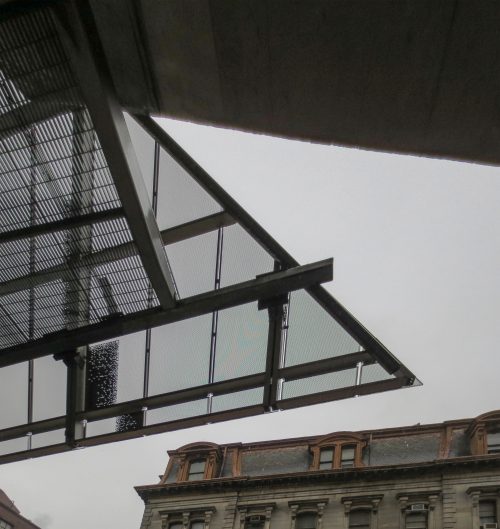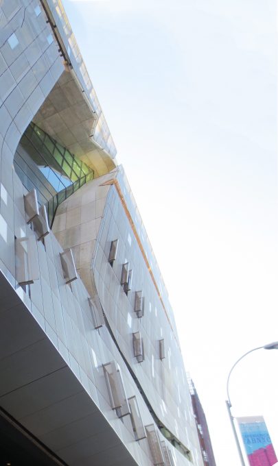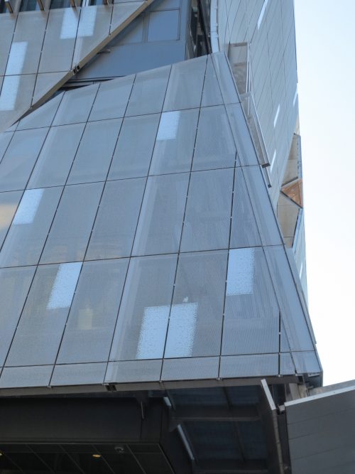304 panneaux en acier inoxydable ont été fabriqués avec un « cheveux d’ange » dont la finition aide en ligne usure de cache-rayures fines qui peut ajouter au fil des ans. Les forages d’un diamètre de 1/8 de pouce et la couverture entre 50-90% de la surface des panneaux, permettant une vue sur l’extérieur et tout en réduisant l’éblouissement. Les panneaux sont 0.60×1.82m et fixe avec cadre en aluminium vis en acier. Ces sections de panneau unifiées sont reliés avec le bord de la brame par un système d’ingénierie avec des extrusions en aluminium. Partiellement panneaux métalliques sont à 0.30cm loin de la paroi intérieure du verre, mais sur la façade ouest cette distance augmente à 3,04 / 3,66 m formant un auvent au-dessus de l’entrée.