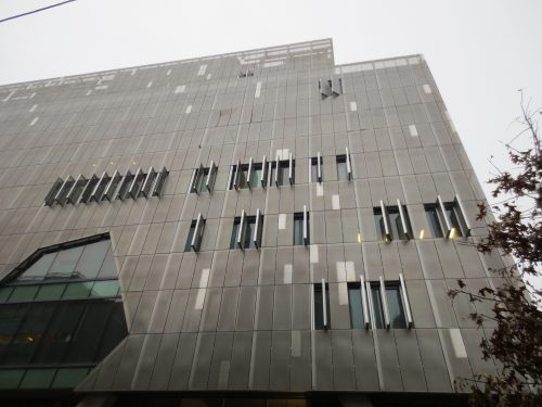 Une peau extérieure créé par une couche semi-transparente de l’acier inoxydable perforé couvre la façade en verre du bâtiment pour assurer le contrôle de l’environnement intérieur, tandis que des transparences peut révéler l’activité créatrice survenant dans. Les panneaux de verre de la paroi extérieure sont montées sur aluminium.