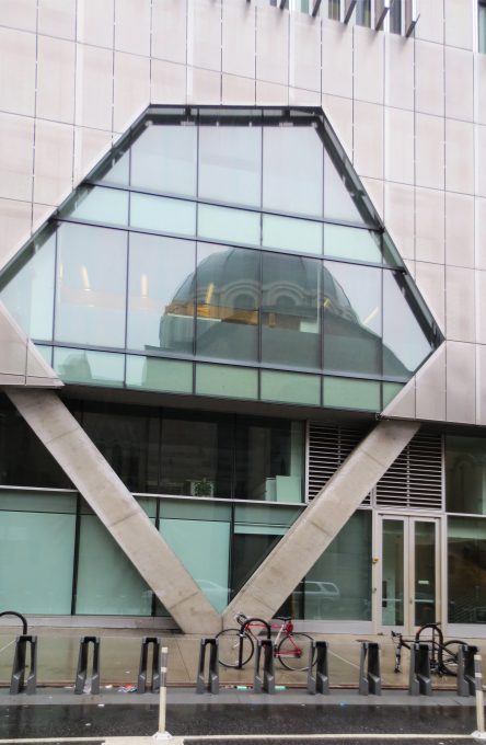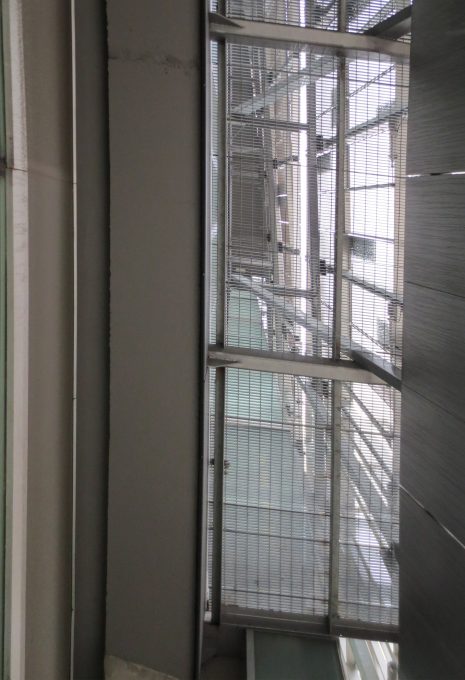 Sauf dans quelques endroits où le visage de métal recule pour révéler toutes les sections de verre, la paroi interne du bâtiment se compose d’un système de mur de la fenêtre en dehors de la dalle. Dalles entre le système comprend un tympan peint sol noir se lève 1,06 m.