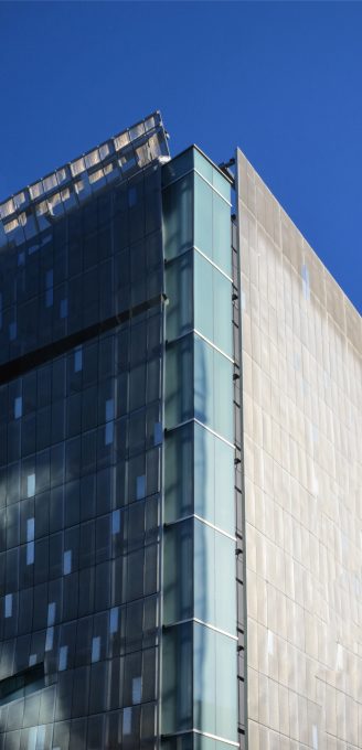 Les zones exposées sont des murs rideaux de verre ont été structurellement unifiés et assemblés dans des cadres en aluminium.