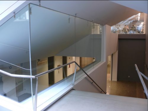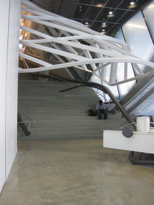 Depuis le hall d’entrée, dont la hauteur atteint le dernier étage, un grand escalier de 6,10 m de large et revêtu d’un treillis ondulé quatre niveaux sont élevés à terminer par un vitrage double hauteur salon, surplombant la ville et destiné Les étudiants comme le Ware & Drucker Salon des étudiants, qui abrite une petite cafétéria. Le grand escalier est utilisé à la fois pour la montée et espace de loisirs pour les étudiants.
