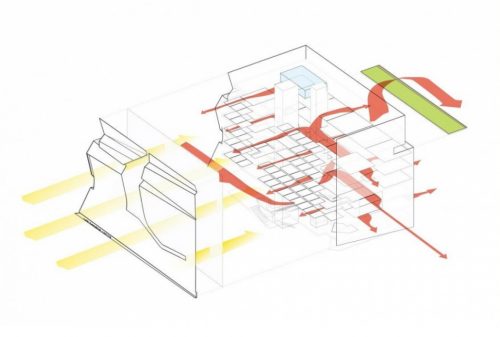 L’efficacité énergétique est entraînée par l’utilisation de panneaux de chauffage et de refroidissement placées sur le chauffage de toit, ce qui rend le nouveau bâtiment résultant 40% plus économe en énergie qu’un bâtiment standard en son genre. Un toit vert isole le bâtiment, réduisant l’effet «îlot de chaleur». L’eau de pluie est filtrée et réutilisée pour l’entretien.