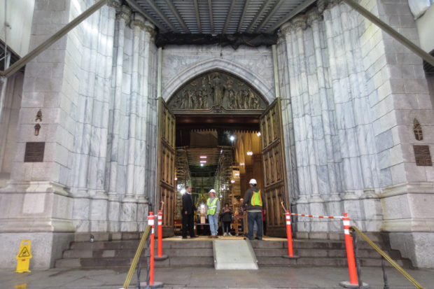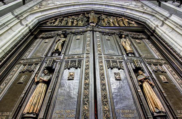 Les portes principales de la 5e Avenue, accueillant les visiteurs ont un poids de 4,209 kg chacun. Leurs sculptures représentent front saints, y compris Saint-Joseph, Saint-Isaac Jogues, Saint Kateri Tekakwitha, St. Patrick, St. Frances Xavier Cabrini et St. Elizabeth Ann Seton. Ils ont été restaurés en 2013.
