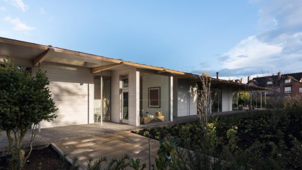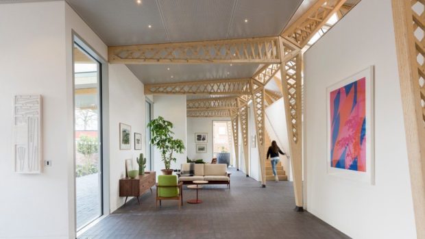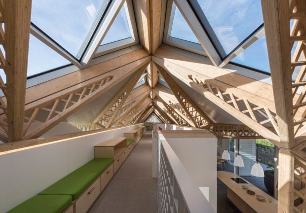 De grandes fenêtres s’étendent sur tous les côtés du bâtiment, offrant une vue sur le jardin, tandis que des lucarnes triangulaires permettent à la lumière de filtrer dans les salles de la mezzanine, où se trouvent les bureaux.