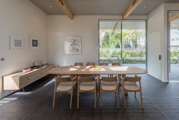À l’intérieur, les sols sont recouverts de carreaux de carrière qui se prolongent sur la grande terrasse extérieure protégée par un profond porte-à-faux. Le sol au-delà de la terrasse est recouvert de pavés d’argile qui se mêlent aux espaces verts.