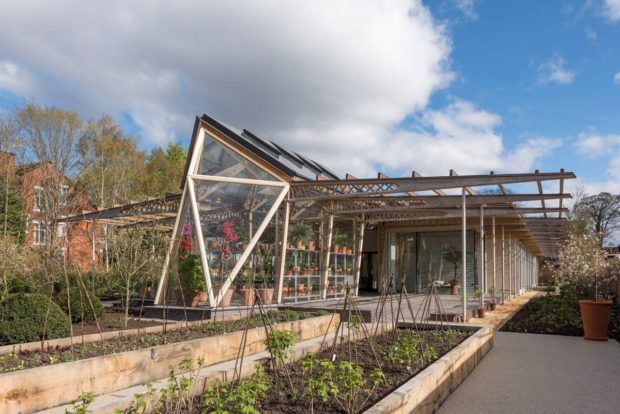 L’extrémité sud du bâtiment s’étend jusqu’à une serre, célébration de la lumière et de la nature. Sa façade en verre à facettes fait écho aux lucarnes triangulaires du bâtiment.