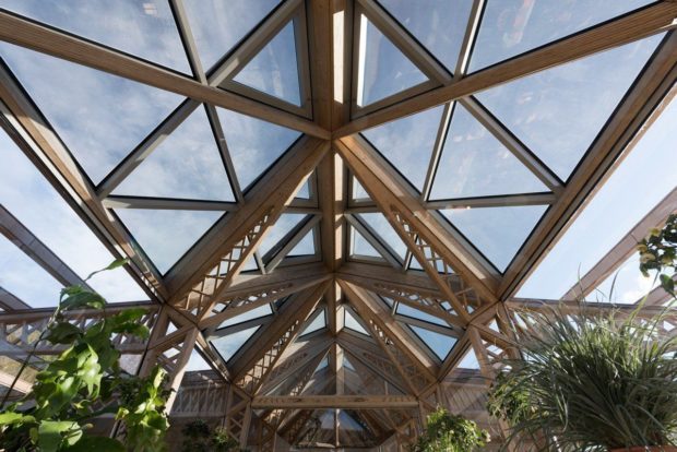 Le système de fixation du verre sur mesure dans la serre est constitué d’une structure en bois stratifié.