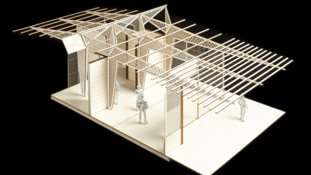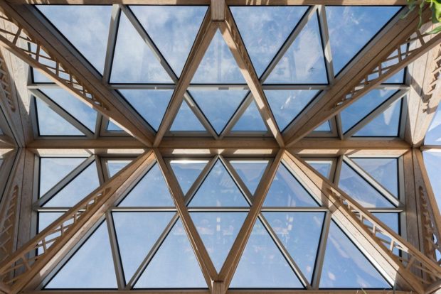 Le design est le résultat d’une structure complexe composée d’un réseau de colonnes et de poutres en bois effilées, chacune soutenue par des poutres transversales angulaires formant des motifs en zigzag. La disposition diagonale des fermes en plan le long de la colonne centrale permet à la structure d’assurer la stabilité du toit sans nécessiter de contreventement ou de renforcement supplémentaire.