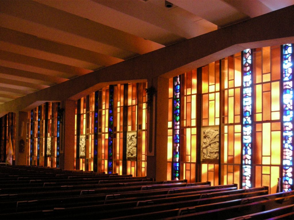 Dans la chapelle catholique, les cristaux forment encore des fenêtres traditionnelles, verticalement le long des parois latérales de l’espace. Il a été utilisé de la maçonnerie préfabriquée et le verre ambre à facettes. Sur l’autel de l’autel est représenté par une fresque de mosaïque de verre, une représentation abstraite du ciel, conçu par Lumen Martin Winter.
