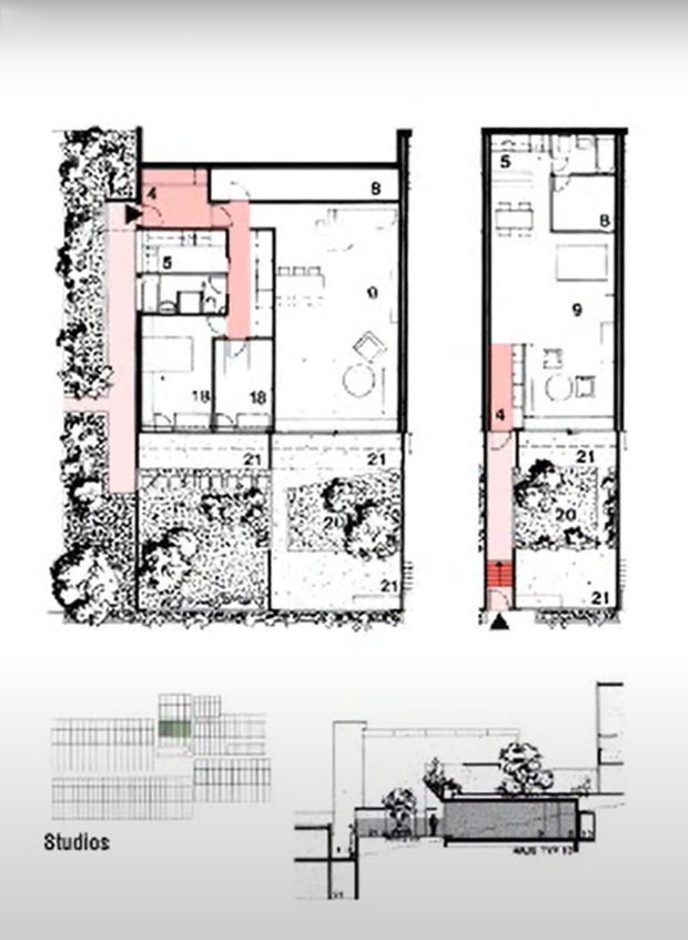 La différence entre les maisons avec des baies de 5 mètres et 4 mètres, est que, dans ce dernier les escaliers sont disposées transversalement, alors que dans l’autre, sont disposés longitudinalement.