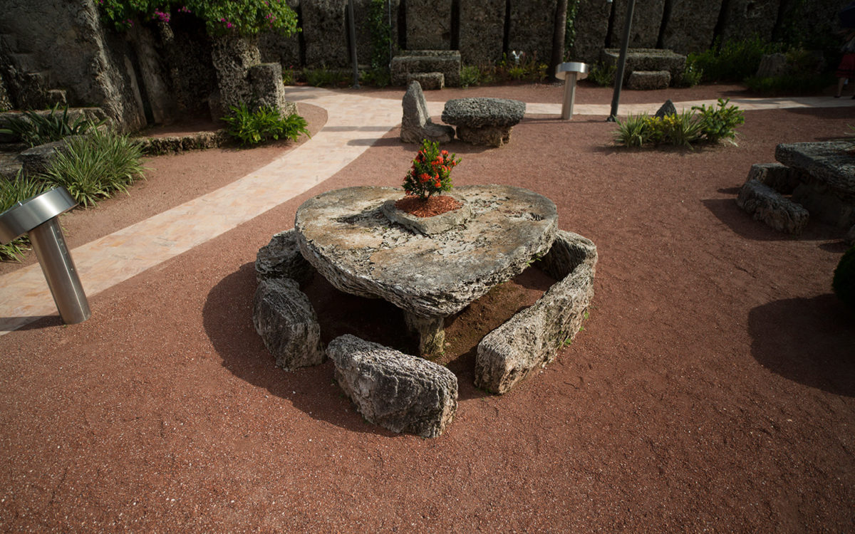 Rocher Gate Park, comme Edward Leedskalnin appelé le lieu, la construction a commencé à l’origine dans la ville de la Floride vers 1923. En 1936, Edward a commencé une structure mobile de trois ans d’environ 10 miles (16 km) au nord de son emplacement actuel à Homestead, en Floride, à l’intersection de US 1 (South Dixie Highway) et Southwest 157 Avenue ( SW 157e Avenue). Il a continué à être construit dans le nouvel emplacement jusqu’à sa mort en 1951.