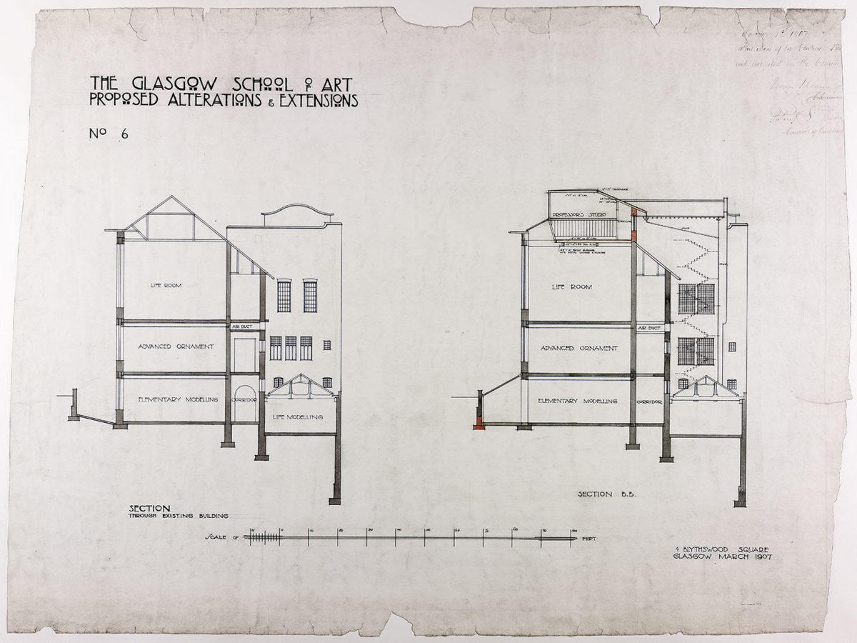 La construction a commencé en 1897. En Décembre 1899, la première partie du projet a été achevée. Cela comprenait le musée, le bureau du directeur et de la salle de réunion. Il a fallu huit ans pour réunir les fonds nécessaires pour poursuivre le travail. Pendant ce temps Mackintosh a continué à travailler sur le projet de construction. La commission scolaire lui a demandé quelques modifications et extensions projetées du projet d’origine, y compris une deuxième salle de classe de sol et des ateliers situés dans le sous-sol.