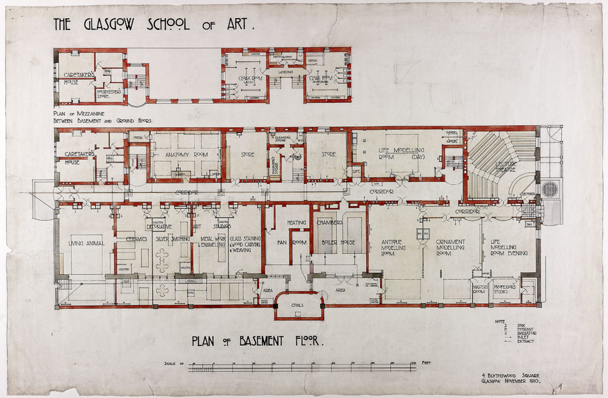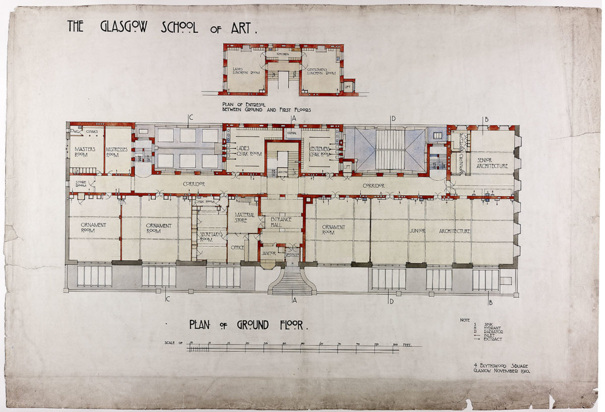 Dans le centre du rez-de-chaussée l’entrée principale, qui fait face à la rue Renfrew se trouve. La distance acquis le bâtiment de la rue est utilisé dans ce point central pour placer le vol des escaliers à l’entrée de l’école. Une fois à l’intérieur, nous trouvons le hall, à côté de qui est l’espace pour le concierge et l’escalier principal à l’avant. Des deux côtés de ces services sont des femmes et des hommes. De même à l’étage inférieur, il a également organisé par un couloir central. A cet étage sont des salles de classe architecture, la décoration, la gestion du centre de chambres, des vestiaires pour les hommes et les femmes, et des espaces de stockage. Il est situé sur la mezzanine entre le rez-de-chaussée et le premier est la salle à manger des hommes et des femmes.