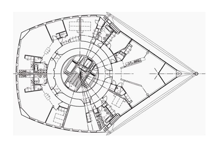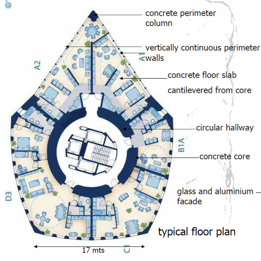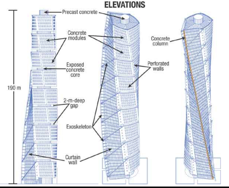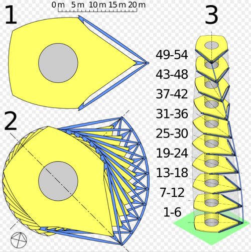 Le bâtiment, construit en acier, verre et béton, est divisée en neuf cubes rotatifs dont le principal élément structurel est un noyau en béton armé, diamètre de 10,6 mètres (comme une colonne vertébrale). Son centre corresponde exactement avec l’axe de rotation de plantes. L’extérieur du bâtiment est recouverte de verre et de panneaux d’aluminium. Chaque cube a six usines.