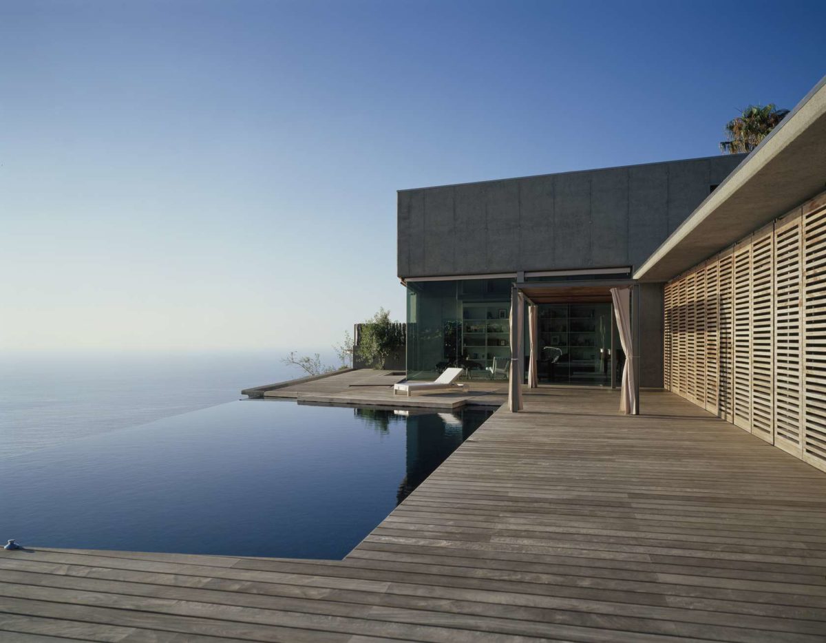 Les deux volumes mentionnés sont basés sur une plate-forme de bois Ipe entourant une piscine, noir et situé sur le bord de bordure de la falaise, de sorte que la surface de l’eau apparaît à fusionner avec la mer.