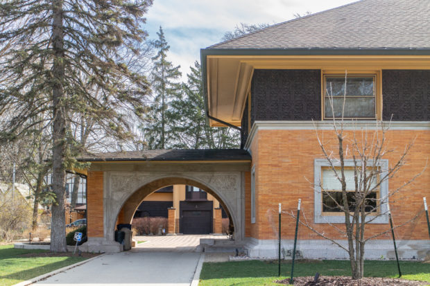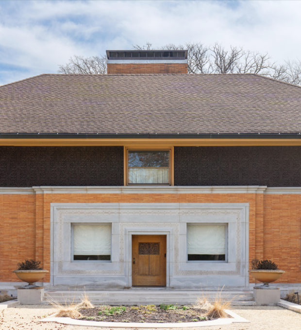 La façade principale présente une symétrie surprenante, un élément que Wright abandonnera rapidement, tout comme les fenêtres à guillotine. Cependant, on y retrouve des éléments fondamentaux de l’architecture résidentielle de FLW, tels que le socle, les toits légèrement inclinés, la cheminée comme élément structurant de l’espace et les deux étages.