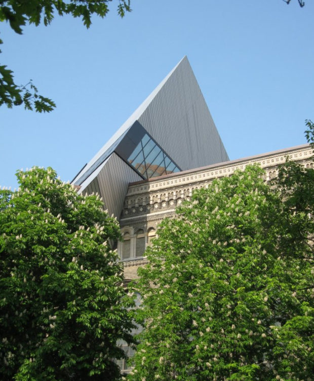 Annexe conçu par Libeskind entoure le bâtiment historique de brique et de pierre sculptée s’est félicité de la ROM depuis 1912 et s’est étendu à des moments différents: un bâtiment élégant de style néo-roman, conçu par Frank Darling et John A. Pearson, élargi plus tard par Alfred H. Chapman et James Oxley. Il réalise également un dialogue intense avec les rues avoisinantes augmente à 37 mètres au-dessus du niveau du sol, volant sur l’une des rues voisines.