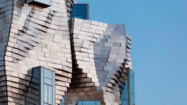 La façade de la tour est composée de 11 000 blocs d’acier inoxydable, disposés de manière irrégulière, qui jouent avec les changements de lumière au cours de la journée et selon l’angle de vue, alternant les reflets argentés le jour et dorés à la tombée de la nuit.