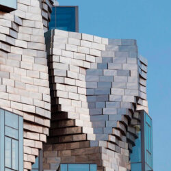 La façade de la tour est composée de 11 000 blocs d’acier inoxydable, disposés de manière irrégulière, qui jouent avec les changements de lumière au cours de la journée et selon l’angle de vue, alternant les reflets argentés le jour et dorés à la tombée de la nuit.
